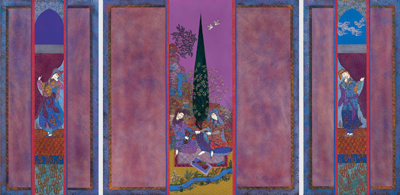- Being in Heaven ,Being in Hell Triptych 75×35 75×75 75×35 2007 gouache on cardbord participated in christies auction Two lovers are seen in the middle panel in a Heavenly setting and just as the nature, are quenched by the spring of love. The pink sky, the blue river, and colors of landscape are reminiscent of traditional miniature paintings, denoting a sublime world. A man and a woman, burning in the fire of estrangement, envy, and sorrow, are seen in the paintings on either side. Each one of the happy couple is the deity of the other. If two people are happy, perhaps two others are sad because they have lost the very same status. If someone achieves love, a status, or a joy, it means that someone else has lost or failed to achieve that love, status, or joy. Geometric composition of this triptych puts major emphasis on the middle panel. Similar to other works of the painter, time and space are employed allegorically. Various symbols designate different meanings.